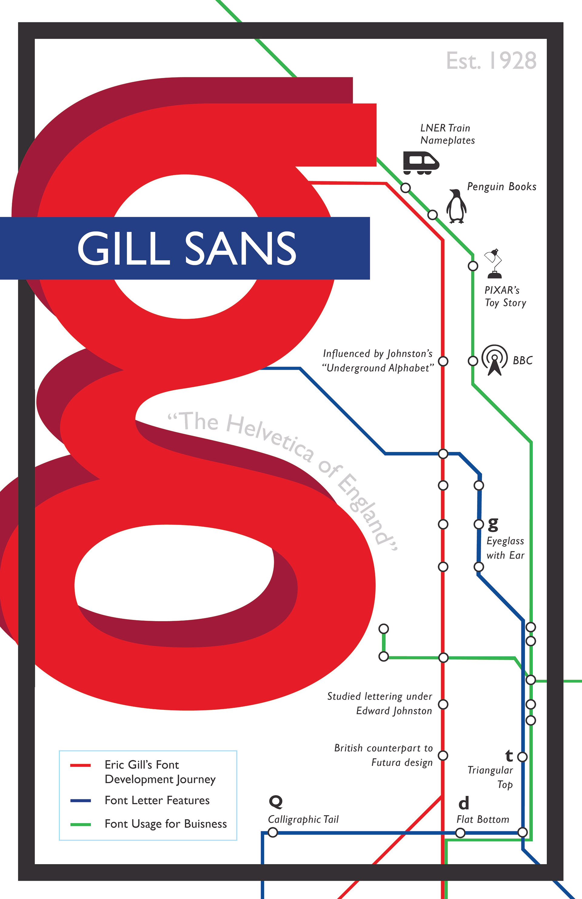 The iconographical design of the right side highlights the research and historical journey of the Gill Sans typeface using the London Underground transit system. These routes represent the actual transit lines of the system and branch to show different information including how it was created, the significant features of the letters, and the iconography of business usage of the font. The information is presented at actual transit stop locations on the Underground map. Examples were depicted through iconography and text for a better understanding of the usage of the font in various companies and projects.